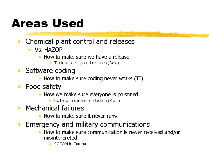 The typical approach to identifying potential problems or issues in a planned activity is a checklist of some sort. In the industrial world two of the most widely used are FMEA and HAZOP. In both of these, a "normally" operating process, or possibly its preliminary design, is challenged by considering the consequences of operating outside its design parameters and then making a decision about those consequences and the cost of containment. The approach in both tools is asking the question "what". Those experienced in these tools can testify as to how much caffeine is required during such a review. Despite decades of the use of these tools, we continue to experience industrial accidents.