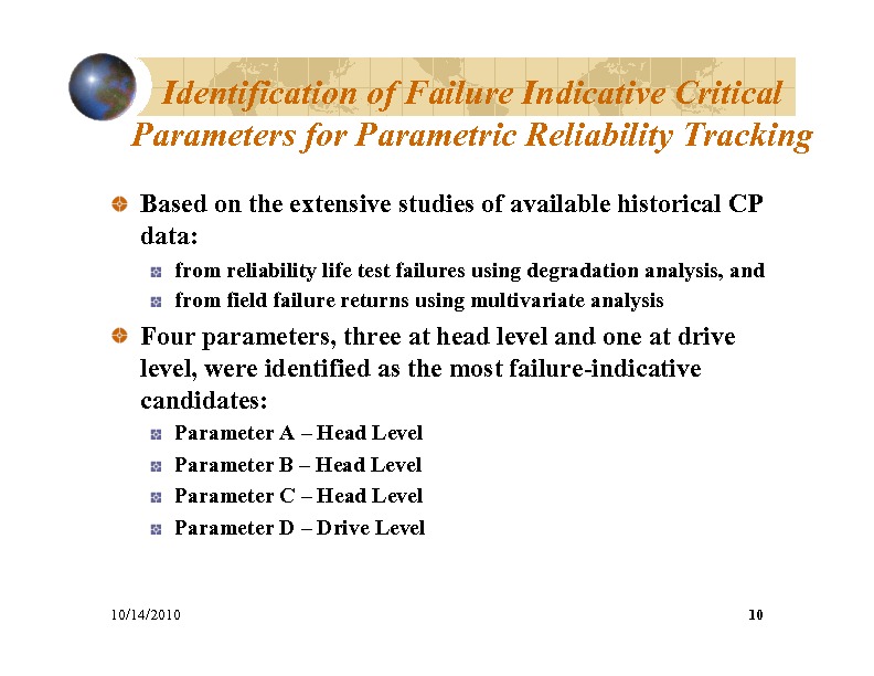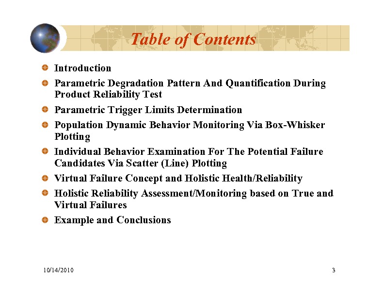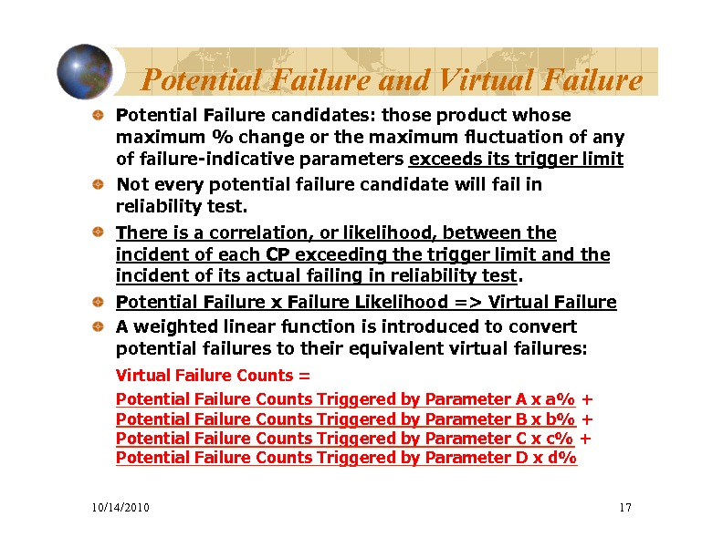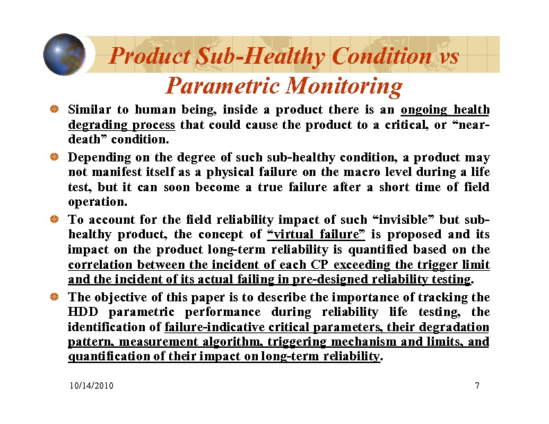 This talk presents a parametric perspective of product reliability in terms of virtual failures quantified by time degradation of product failure-governing critical parameters (CP). Traditionally, product reliability is quantified and measured by the confirmed failures through failure analysis (FA); i.e., a product is characterized by two distinctive states: either "functioning" ("surviving") or "failed". However, similar to human being, inside a product there is an ongoing health degrading process that could cause the product to a critical, or "near-death" condition. Depending on the degree of such sub-healthy condition, a product may not manifest itself as a physical failure on the macro level during a life test, but it can soon become a true failure after a short time of field operation.To account for the field reliability impact of such invisible but sub-healthy product, the concept of "virtual failure" is proposed and its impact on the product long-term reliability is quantified based on the correlation between the incident of each CP exceeding the trigger limit and the incident of its actual failing in reliability life test. The objective of this paper is to describe the importance of tracking product parametric performance during reliability life test, the identification of failure-indicative critical parameters, their degradation pattern, measurement algorithm, triggering mechanism and limits, and quantification of their impact on long-term reliability.