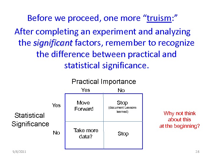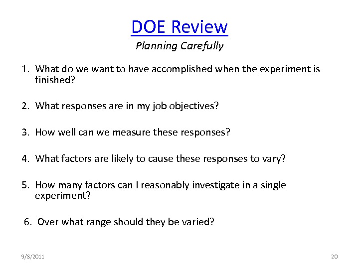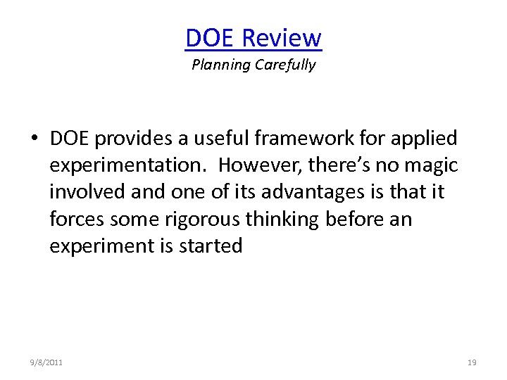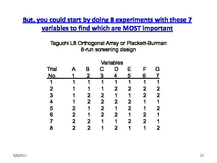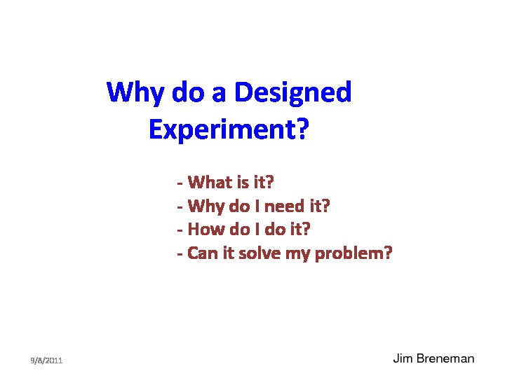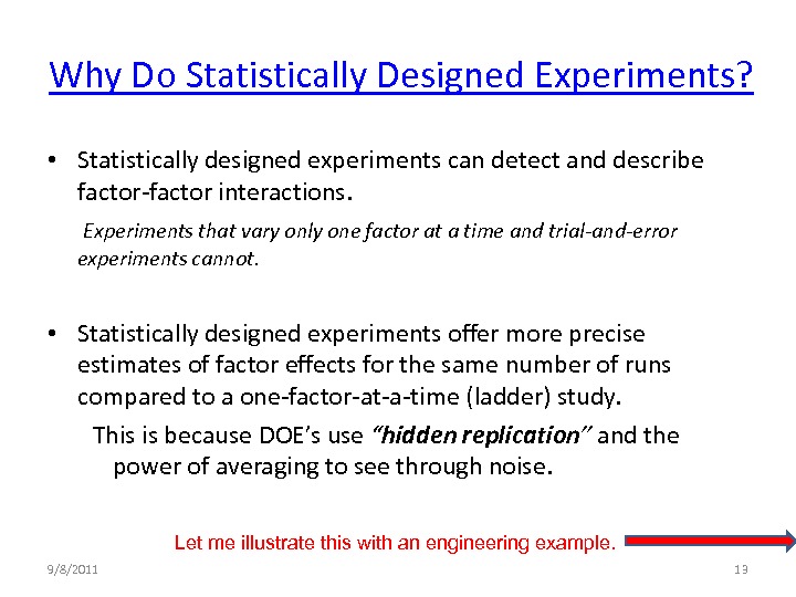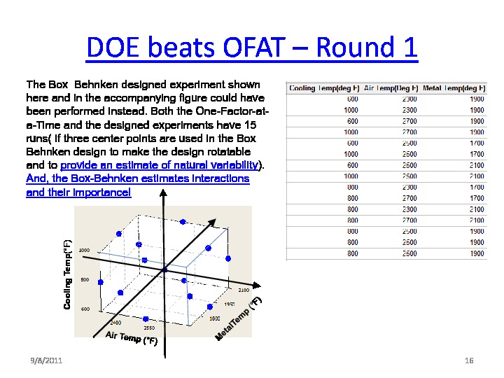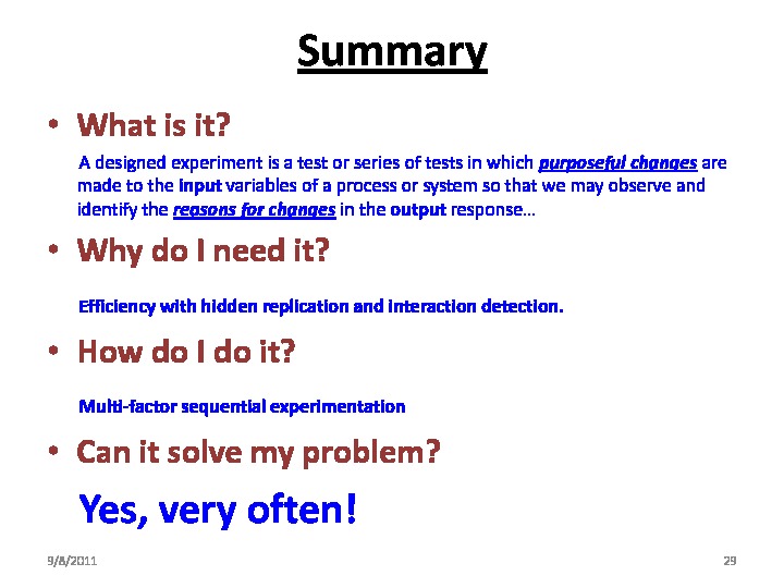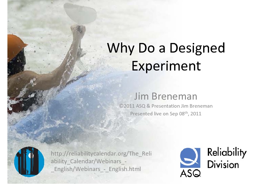 This webinar looks at answering this question, not by going deeply into the various designed experiment types, but from a process improvement perspective. Progressing from a definition of a designed experiment, to why and when do I need a designed experiment? What's the concept? (And why can't I do a "one-factor-at-a-time" series of experiments? -- to will this tool solve REAL WORLD problems?)