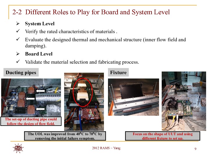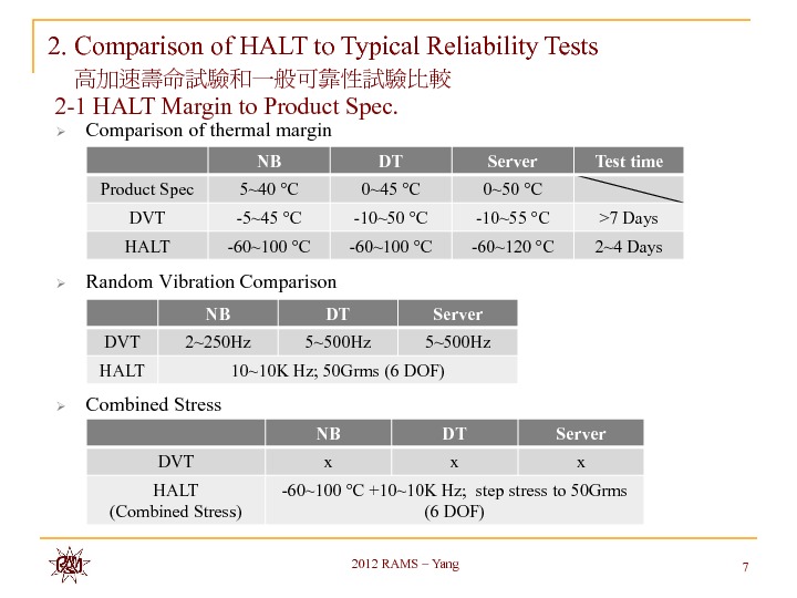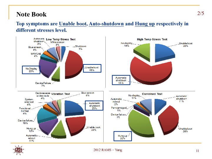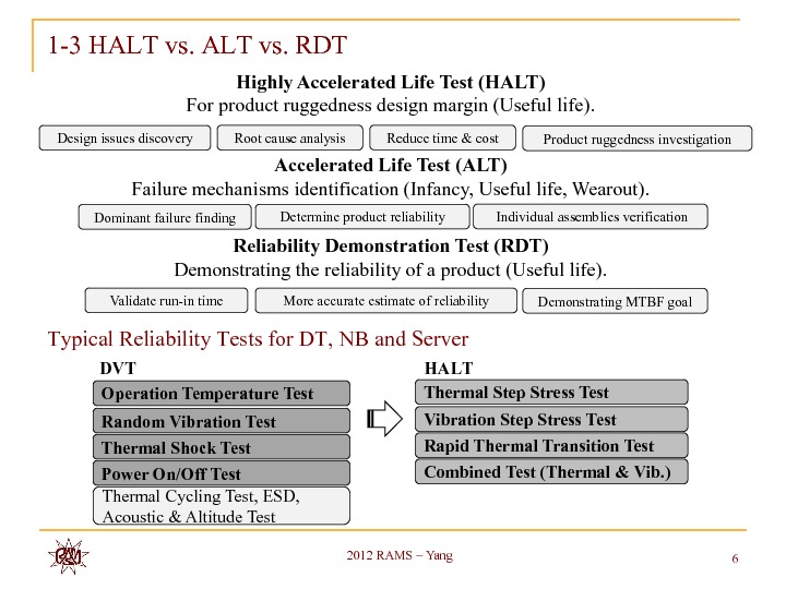 Application of HALT at design stage becomes more and more common in electronics industry. Many discussions and disputations of the HALT test interpretation are in full swing. With our HALT test experiences in notebook, desktop and server products, we intend to share and discuss the safety factor of exact product operating limits to its operation specifications in temperature and vibration and common failure modes stimulated thereby. A general perspective of the test setup techniques by product types and its influence is also provided. The distinctive roles of HALT on board level and system level from thermal flow field point of view are also shared in this paper.