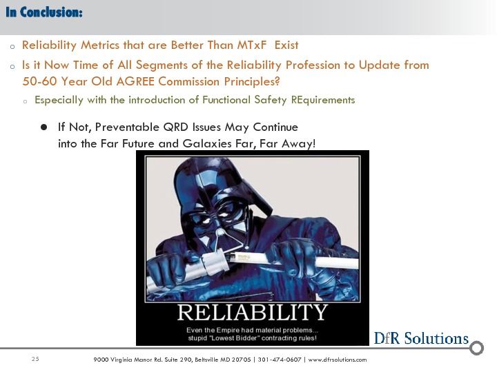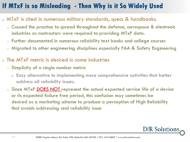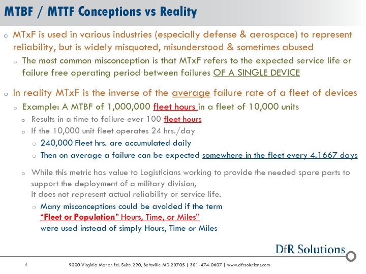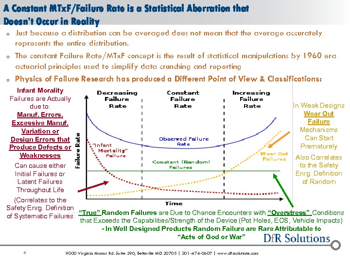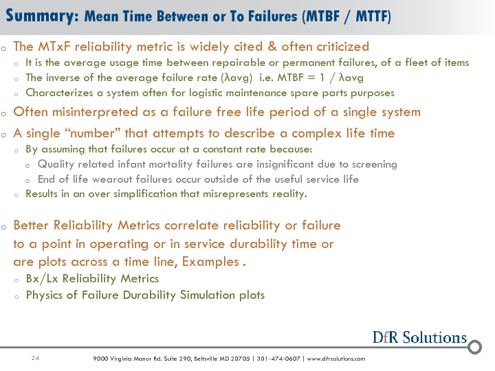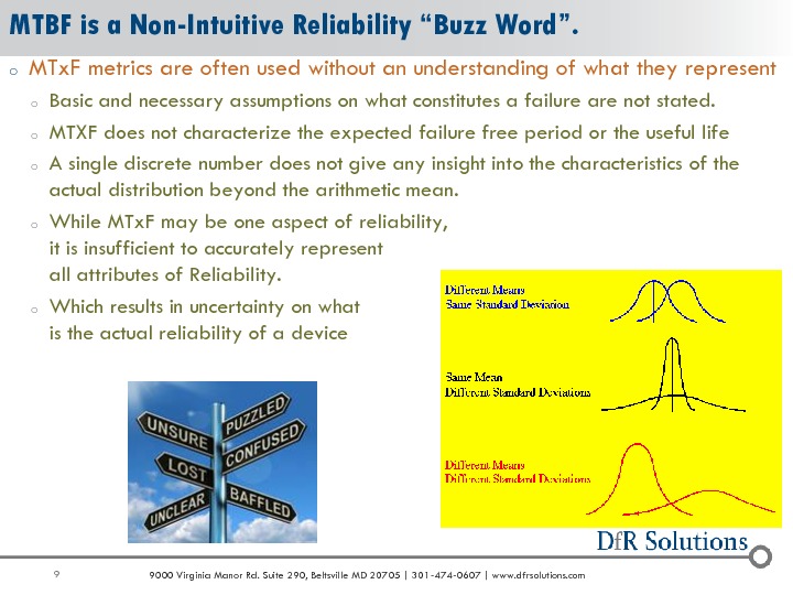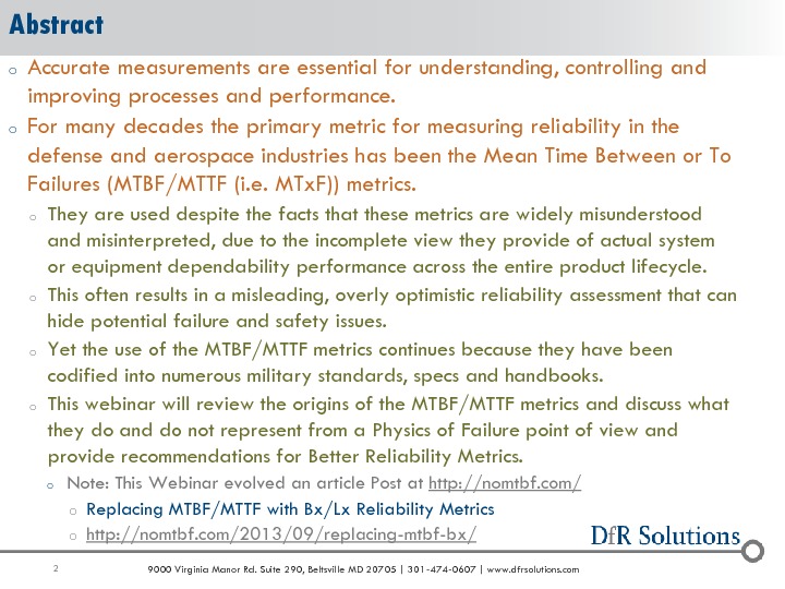 This webinar will review the origins of the MTBF/MTTF metrics and discuss what they do and do not represent from a Physics of Failure point of view. Other more comprehensive ways to track equipment and product dependability will be presented. These alternative methods are often used in highly competitive industries that need to be dynamic, rapidly responsive and practice continuous improvement methods to achieve efficiency along with world class Quality, Reliability & Durability in order to maintain or better yet growing their market share and profitability.