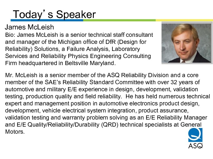 James McLeish is a senior technical staff consultant and manager of the Michigan office of DfR (Design for Reliability) Solutions. Mr. McLeish is a senior member of the ASQ Reliability Division over 32 years of automotive and military E/E experience in design, development, validation testing, production quality and field reliability. He has held numerous technical expert and management position ...read more