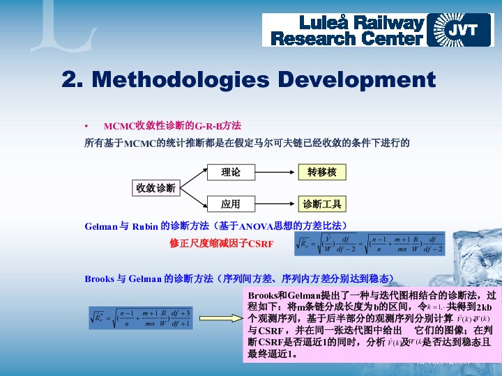 This presentation aims to show a study on propose, develop and test an integrated reliability analysis for railway industry, by which to support decision making on maintenance strategies optimization. This integrated analysis applies traditional statistics theories as well as Bayesian statistics using Markov Chain Monte Carlo (MCMC) methodologies. In this study, the integrated procedure for Bayesian reliability inference using MCMC is applied to a number of case studies using locomotive wheel degradation data from Iron Ore Line (Malmbanan), Sweden. The research explores the impact of a locomotive wheel’s installed position on its service lifetime and attempts to predict its reliability characteristics by using parametric models, non-parametric models, frailty factors, etc.