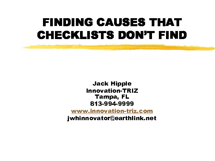 The typical approach to identifying potential problems or issues in a planned activity is a checklist of some sort. In the industrial world two of the most widely used are FMEA and HAZOP. In both of these, a "normally" operating process, or possibly its preliminary design, is challenged by considering the consequences of operating outside its design parameters and then making a decision about those consequences and the cost of containment. The approach in both tools is asking the question "what". Those experienced in these tools can testify as to how much caffeine is required during such a review. Despite decades of the use of these tools, we continue to experience industrial accidents.