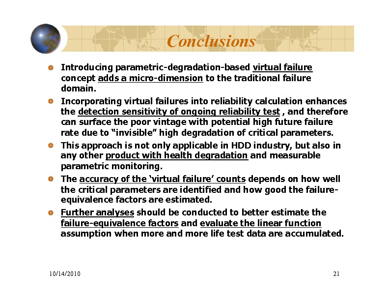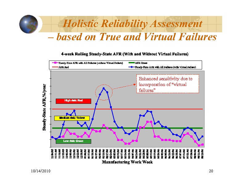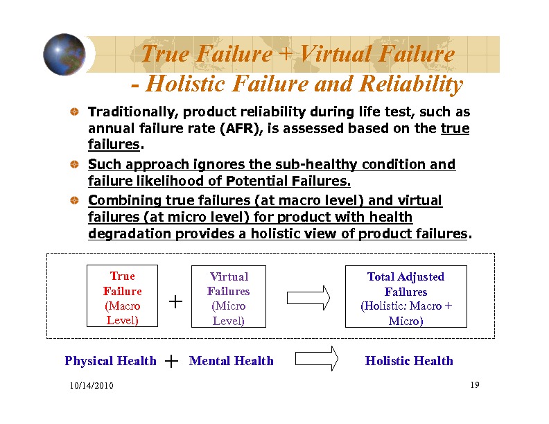 This talk presents a parametric perspective of product reliability in terms of virtual failures quantified by time degradation of product failure-governing critical parameters (CP). Traditionally, product reliability is quantified and measured by the confirmed failures through failure analysis (FA); i.e., a product is characterized by two distinctive states: either "functioning" ("surviving") or "failed". However, similar to human being, inside a product there is an ongoing health degrading process that could cause the product to a critical, or "near-death" condition. Depending on the degree of such sub-healthy condition, a product may not manifest itself as a physical failure on the macro level during a life test, but it can soon become a true failure after a short time of field operation.To account for the field reliability impact of such invisible but sub-healthy product, the concept of "virtual failure" is proposed and its impact on the product long-term reliability is quantified based on the correlation between the incident of each CP exceeding the trigger limit and the incident of its actual failing in reliability life test. The objective of this paper is to describe the importance of tracking product parametric performance during reliability life test, the identification of failure-indicative critical parameters, their degradation pattern, measurement algorithm, triggering mechanism and limits, and quantification of their impact on long-term reliability.