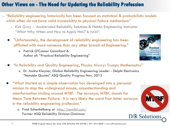 This webinar will review the origins of the MTBF/MTTF metrics and discuss what they do and do not represent from a Physics of Failure point of view. Other more comprehensive ways to track equipment and product dependability will be presented. These alternative methods are often used in highly competitive industries that need to be dynamic, rapidly responsive and practice continuous improvement methods to achieve efficiency along with world class Quality, Reliability & Durability in order to maintain or better yet growing their market share and profitability.