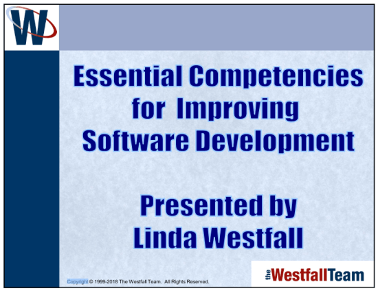 On Thu, Jul 12, 2018 Linda Westfall gave a webinar on Essential Competencies for Improving Software Development